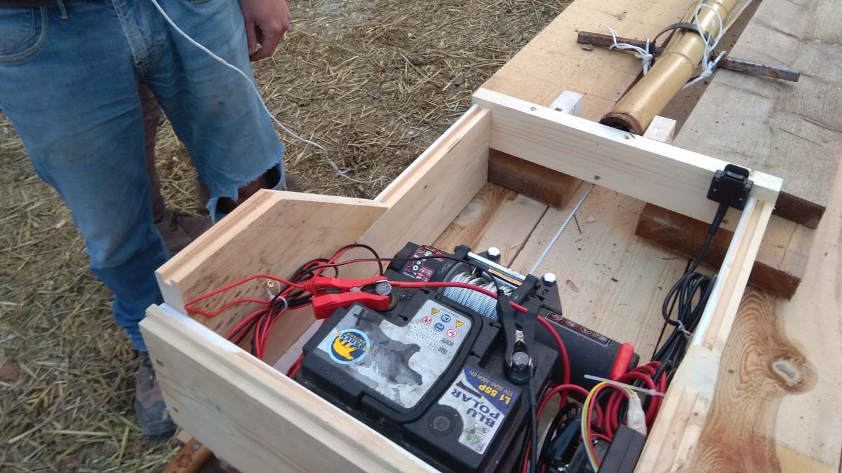 Fu così che il team Poliedra, nell’autunno 2020, iniziò le sperimentazioni. Prima con un verricello montato su un quad, poi con un sistema più raffinato: un alloggio in legno, una batteria di piccole dimensioni e un inverter per la corrente a 220V. Legando lo splitter al gancio del verricello e mettendo in tensione il bambù sul parafango (tenuto fermo da un barattolo di salsa di pomodoro – the Italian way!), azionammo il meccanismo. Trascurando qualche piccola norma di sicurezza, potemmo finalmente dire: FUNZIONA!